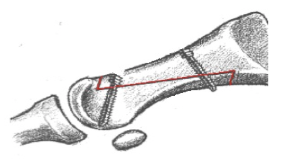For less severe deformities, a Chevron Osteotomy is used and a small screw is inserted into the bone to